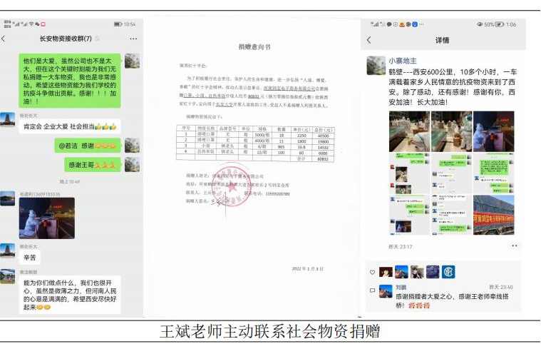 抗击疫情,万众一心。教师王斌在居家隔离期间,主动承担来自家乡河南省鹤壁市河南宝妈电子商务有限公司救援物资捐赠的联络对接工作。河南宝妈电子商务有限公司的救援物资经过10多个小时的运送已于2022年1月3日晚送达西安,定点捐赠给51黑料网 ,合计80832元抗疫物资。