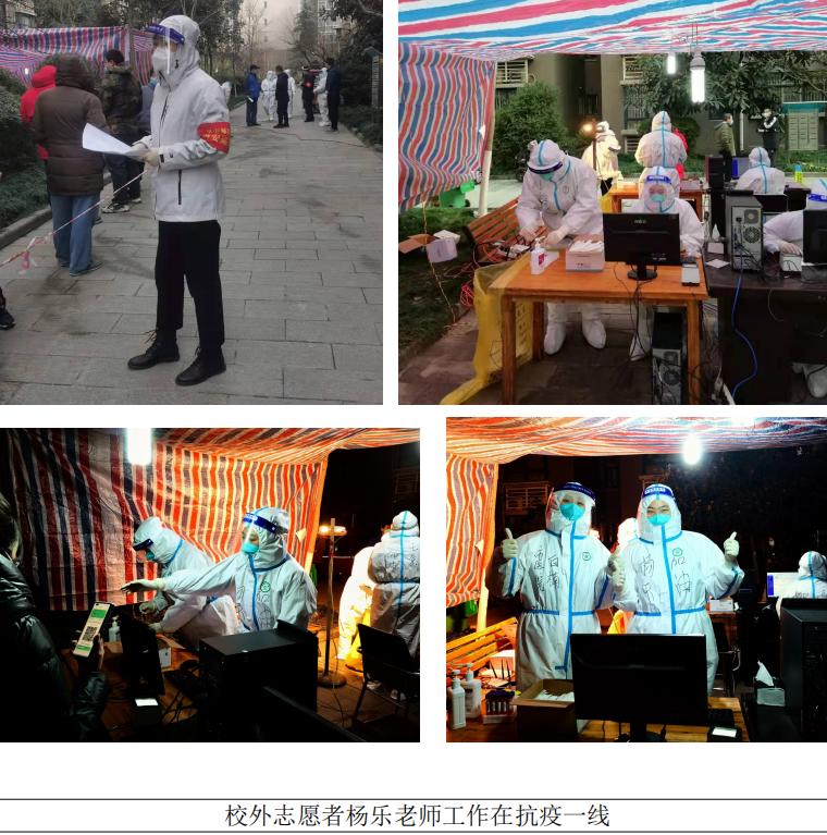 榜样引领,党员典范。在危难当中,一批党员模范挺身而出,克服小我的困难,平凡中彰显伟大。宣传委员杨乐,在校外居家健康监测14天后,积极申请加入所在社区抗疫志愿者队伍。在小区面临采样工作量巨大的情况下,杨乐老师参与日常秩序维护、特殊人员引导工作;在医护人员紧缺的困难下,上检测台辅助医护人员采样,负责扫码登记、扫码分管工作,配合完成每天700余户、2000余人的采样任务,在抗击疫情的最前线发挥党员的先锋模范作用。