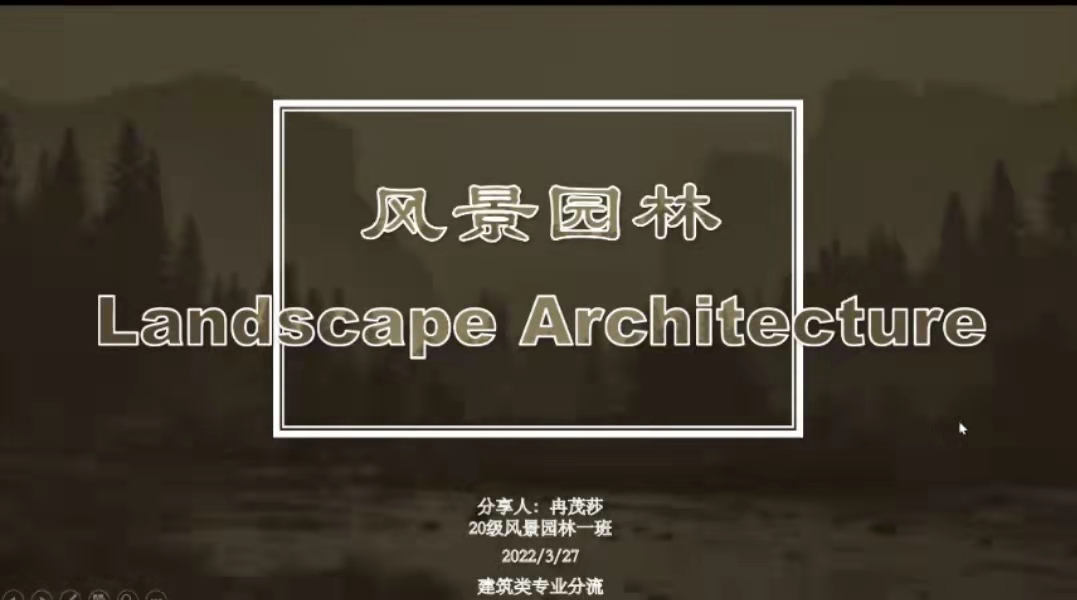2020级冉茂莎同学为我们介绍了风景园林的相关内容。冉茂莎同学幽默地说到,风景园林并不只是简单地“种树”,而是用艺术的手段,处理人、建筑与环境之间复杂关系的一门学科。相比较于建筑学和城乡规划,风景园林更具浪漫性。她谈到,要想了解一个学科的发展前景,要多跟老师沟通并广泛收集资料,多多益善。接着,冉茂莎同学简单介绍了风景园林专业的就业方向,包括规划设计研究院、园林规划设计公司、房地产类公司等。