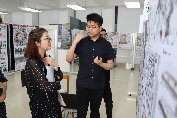 On the scene of the exhibition, graduates from the four universities learned from each other and exchanged professional experience, which ignited a strong academic atmosphere. Students' design works combined with the major, based on reality, focus on practicality and innovation, the design theme shows incisively and vividly. The booth at the event site is divided into 8 groups with the scheme planning and design group as the unit. During the evaluation and exhibition, teachers of each school visited and browsed the graduation design works, and students showed the concept and content of architectural design comprehensively through video, PPT display, drawings display and other ways. The whole process fully demonstrates the students' professionalism and adaptability. The participating teachers highly praised the design of the students and put forward the existing problems and solutions. The public reply was well organized, and the students benefited a lot.