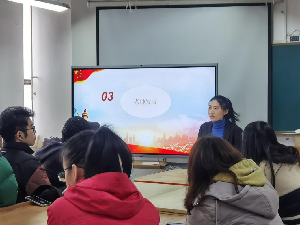 思政班主任贺燕飞老师在班会中指出,同学们要谨记每个人肩负的责任与使命,立志成长为新时代好青年,发挥好榜样典型的示范带动作用。同时贺燕飞老师还带领同学们温固了党的有关知识,倡导大家加强思政与科学文化建设,合理安排好学习与生活的时间,提升个人素养,陶冶情操,成为只争朝夕不负韶华的优秀大学生。