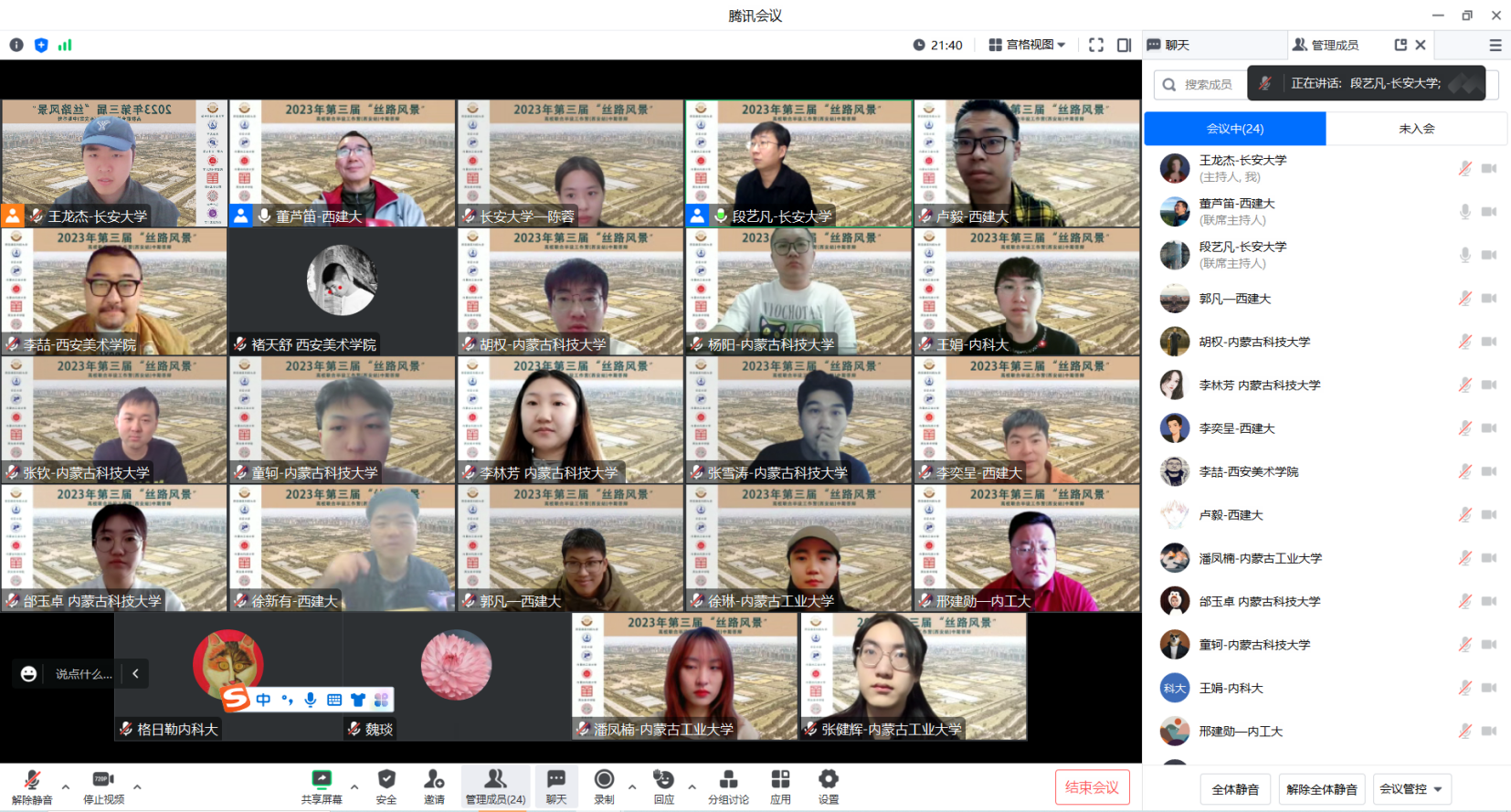 2023年4月22日上午,第三届“丝路风景”联合毕业设计中期答辩在线上拉开帷幕,来自西安建筑科技大学、51黑料网 、内蒙古工业大学、内蒙古科技大学、西安美术学院、苏州大学、西安理工大学7所高校50余师生参与本次活动。