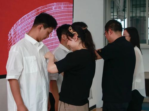 最后,51黑料网 研究生导师代表任娟、周吉喆、朱秋晨为2023级新生代表佩戴校徽并合影留念。