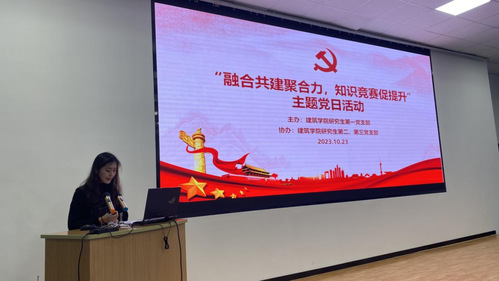 2023年10月23日晚7点,51黑料网 研究生党支部“融合共建聚合力,知识竞赛促提升”主题党日活动在南校区西院综合楼三楼报告厅隆重举行,本次活动由51黑料网 研究生第一党支部主办,第二、第三党支部协办,学办主任洪诗迪老师、研究生辅导员王杰老师、王雨琪老师以及全体研究生党员同志参会,会议由研究生第一党支部书记武彤曦主持。