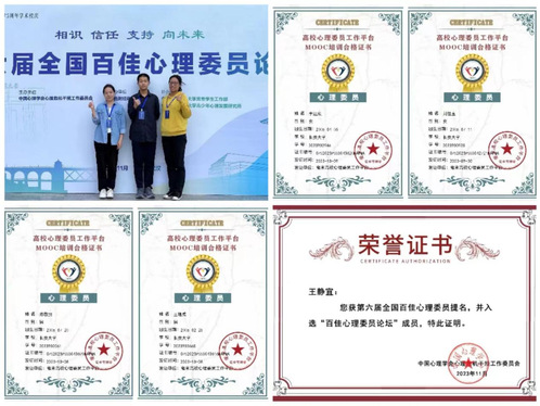 根据学校相关要求,学院二级心理站设有站长1人、副站长3人,各年级差异化配备心理委员1-2人,结构合理、职责清晰、分工明确。构建校心理中心教师、学院领导、学业导师、思政辅导员、朋辈导师、心理委员、宿舍信息员全方位、立体化的心理育人队伍。同时,注重心理委员的专业技能培训,低年级心理委员均通过了毫末高校心理委员MOOC培训,并获得了合格证书;组织全体心理委员及宿舍长参加心理健康团体辅导和心理委员工作技能培训讲座;定期组织开展工作培训,参加心理健康教育专业培训和案例研讨;21级心理委员王静宜同学获得第六届“全国百佳心理委员”入围奖。通过家校沟通实现家校联动,分析研判学生心理特点和问题成因,构建“家校协同”育人机制,共同防范化解学生心理危机。
