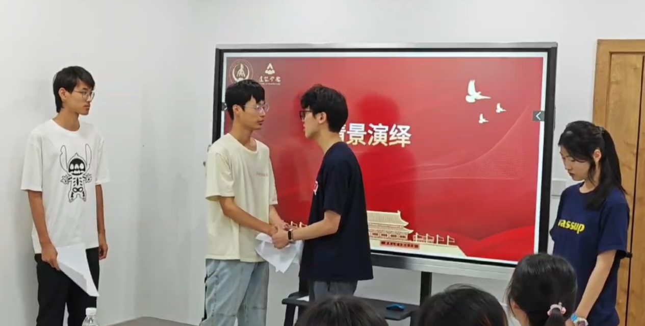 “《红岩》情景扮演”环节同样令人印象深刻。组长黄喆恺携手三名组员,呈现了一场简短而精彩的表演。大家无不为之动容,再一次感悟了革命前辈舍生取义的精神。