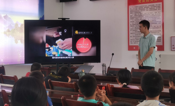 而在谈到禁毒教育时,实践队员表现出了格外的严肃认真。他详细揭示了毒品对个人健康、家庭和社会的巨大危害。针对当前社会上新型毒品层出不穷的情况,实践队员用一些真实的案例向孩子们展示了这些毒品的隐蔽性及其严重的后果,引导他们树立正确的生活态度和价值观,坚决拒绝毒品的诱惑。
