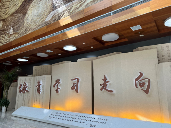 工作人员为实践队员们讲解学习书院大厅标语 谢玉婵摄