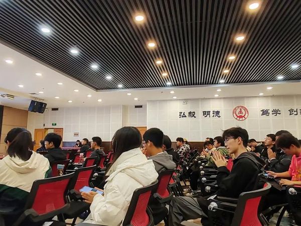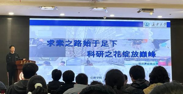 最后,公路学院雷洋寒通过有趣的个人代入方式,让大家“体验”了自己的挑战赛过程,现场的听众们沉浸其中。他向大家讲述了如何进入科研、创业的方式,提出要在创新的情况下进行创业。“求索之路始于足下,科研之花绽放巅峰”,同学们在此汲取经验和力量,促进自身的成长。
