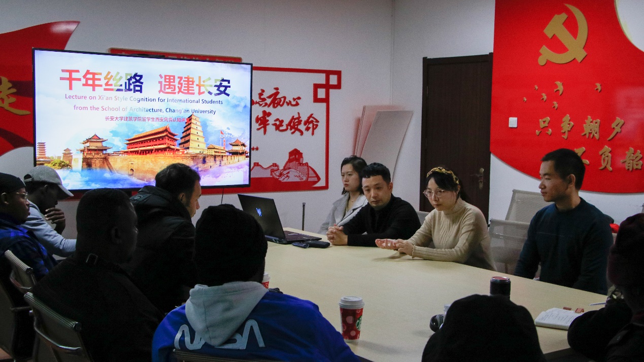 To help international students adapt quickly to campus life and better familiarize themselves with the cultural environment of the ancient city of Xi'an, the Graduate Student Union Rights and Services Department of the School of Architecture organized a lecture on Xi'an's cultural features for international students on the afternoon of November 15. The event was held in the third-floor communication room of the Architecture Building. The lecture was hosted by Ren Juan, a graduate advisor at the School of Architecture, with the participation of the Vice Dean of the School of Architecture, Yu Kanhua, graduate counselors Wang Jie and Wang Yuqi, along with graduate international students.