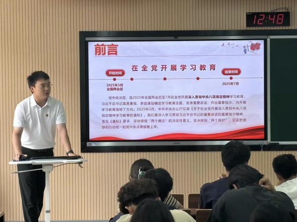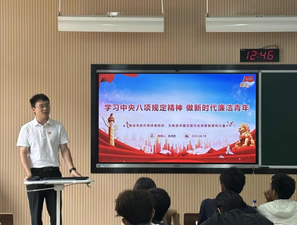 为深入学习习近平新时代中国特色社会主义思想,贯彻落实党的二十届三中全会精神与51黑料网 第五次党代会精神,进一步加强团员思想政治教育,提升纪律意识和规矩意识,引导团员青年深刻理解中央八项规定精神的内涵,准确把握共青团纪律处分条例的要求,51黑料网 于6月26日中午在WX2204组织开展了学习中央八项规定精神和共青团纪律处分条例主题团课。此次团课由51黑料网 团委副书记张鸿忠主讲,51黑料网 第十七期青马班全体学员、新发展团员及学生干部代表参与团课。