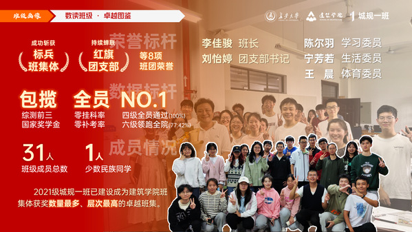 科研实践,扎根专业土壤。学术领域,班级成员累计发表论文 7篇,2次在规划界顶尖学术年会进行宣讲,展现出超越本科阶段的学术素养。实践层面,班级同学 4次深入乡村开展调研,累计形成 8项高水平实践作品,相关成果得到刘加平院士等行业专家的高度认可。外语能力同样领跑全院,英语四级全员通过,六级通过率达 77.42%,在全国大学生英语竞赛中斩获省级特等奖、全国总决赛一等奖等荣誉 10余项,班级成员通过“双语角”与多国留学生交流,奋力向世界讲好中国规划故事。