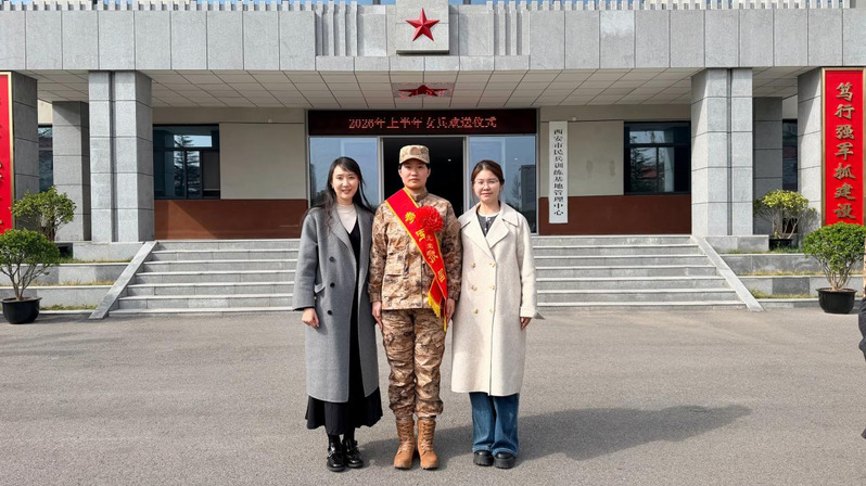 3月19日下午,学校举行2026年春季应征入伍女兵欢送仪式,学工部、武装部部长姬国斌,武装部副部长王恩成,学院党委副书记王妍婷,2025级辅导员王雨琪前往西安市民兵训练基地欢送我院应征入伍女兵——2025级本科生张鑫。